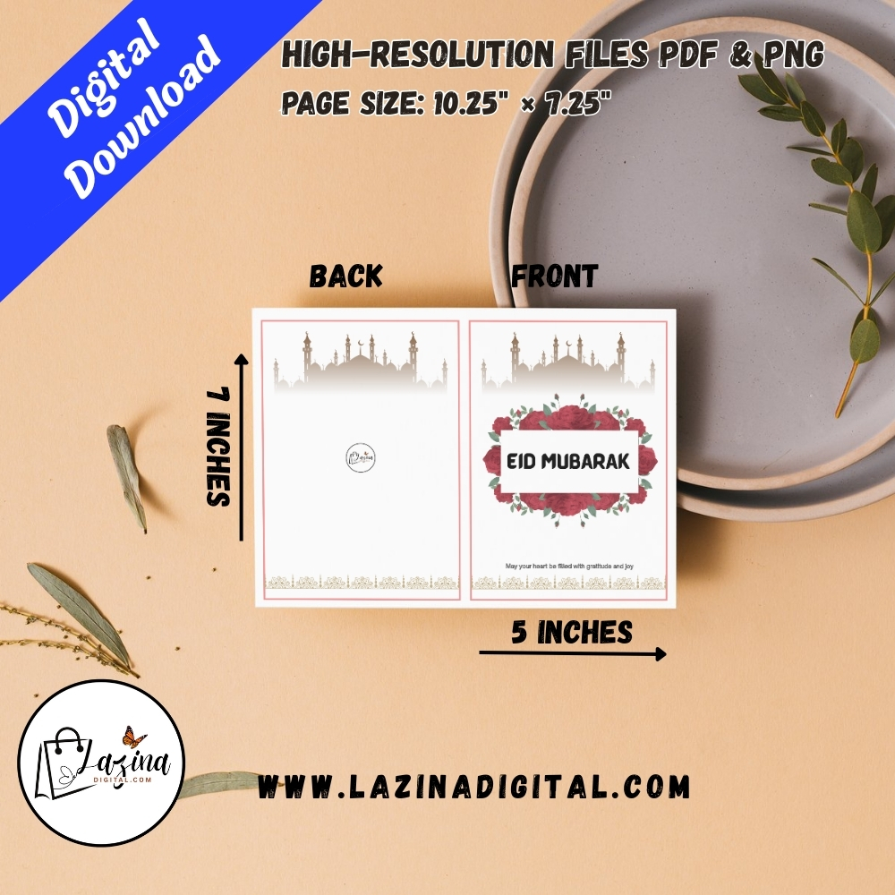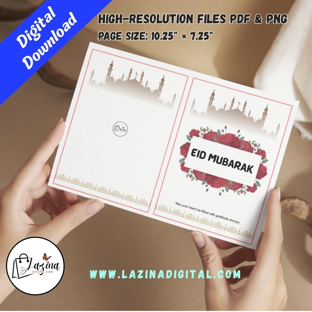 Designed in a folded, book-open style, the card includes a beautifully crafted front and back design, along with a clean inner space where you can write your own Eid message or blessings. The minimalist layout, soft tones, and refined details make this card suitable for family, friends, and loved ones of all ages.