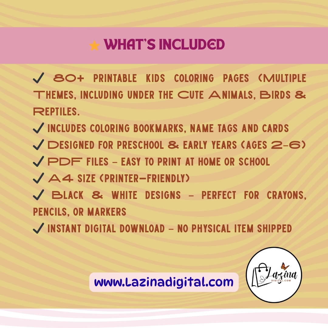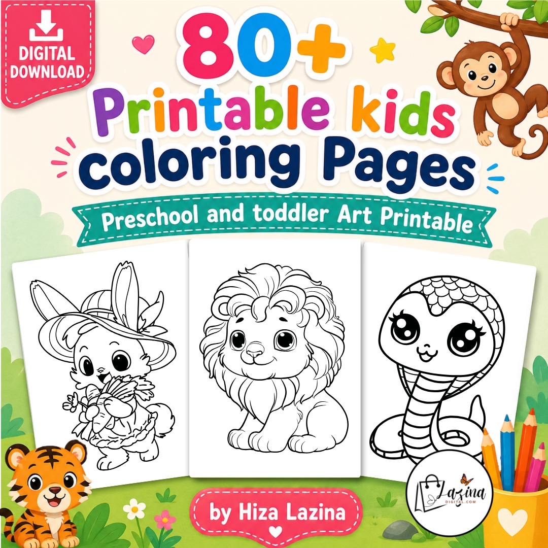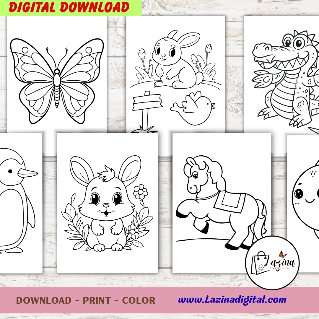 This printable kids coloring book includes 80+ pages of simple and engaging animal themed illustrations. It is designed for toddlers and preschool learners who are starting to explore coloring and creative activities.Each printable page features bold, clean outlines that are easy for small hands to color. The collection includes animals, birds, and reptiles to keep children interested and engaged.This printable coloring book supports early skill development. It helps improve hand control, focus, and creativity through simple, repeatable practice. file is sized at 8.5 x 11 inches, making it easy to print at home or at a local print shop.