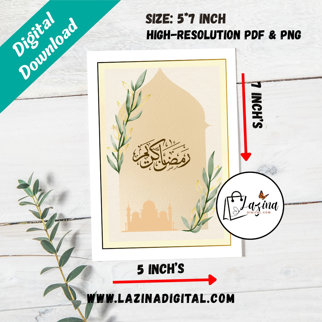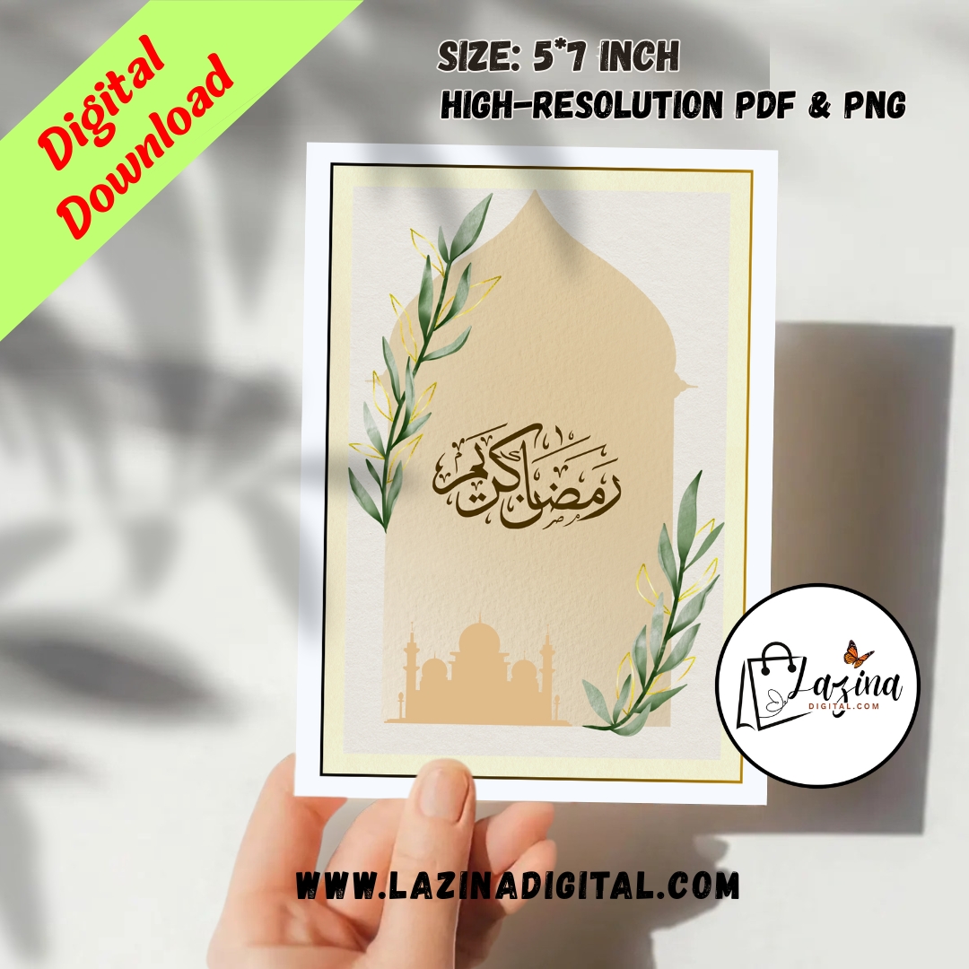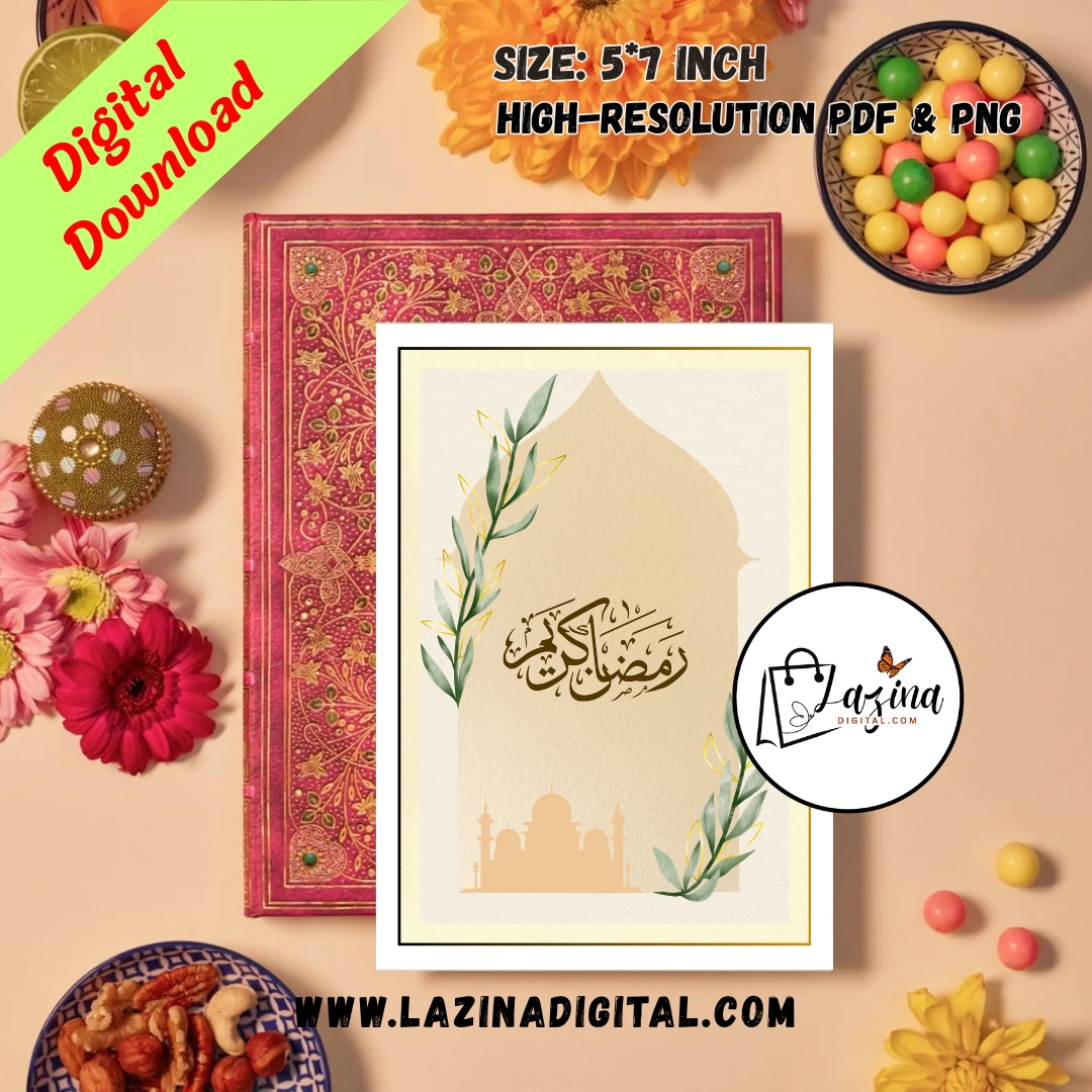 This Ramadan Kareem printable and digital ecard features elegant Arabic calligraphy presented in a minimal and timeless design. With a focus on simplicity and spiritual beauty, this Ramadan Kareem printable digital ecard is perfect for those who appreciate classic Islamic aesthetics. Ideal for digital sharing or printing, it offers a respectful and meaningful way to send Ramadan greetings.