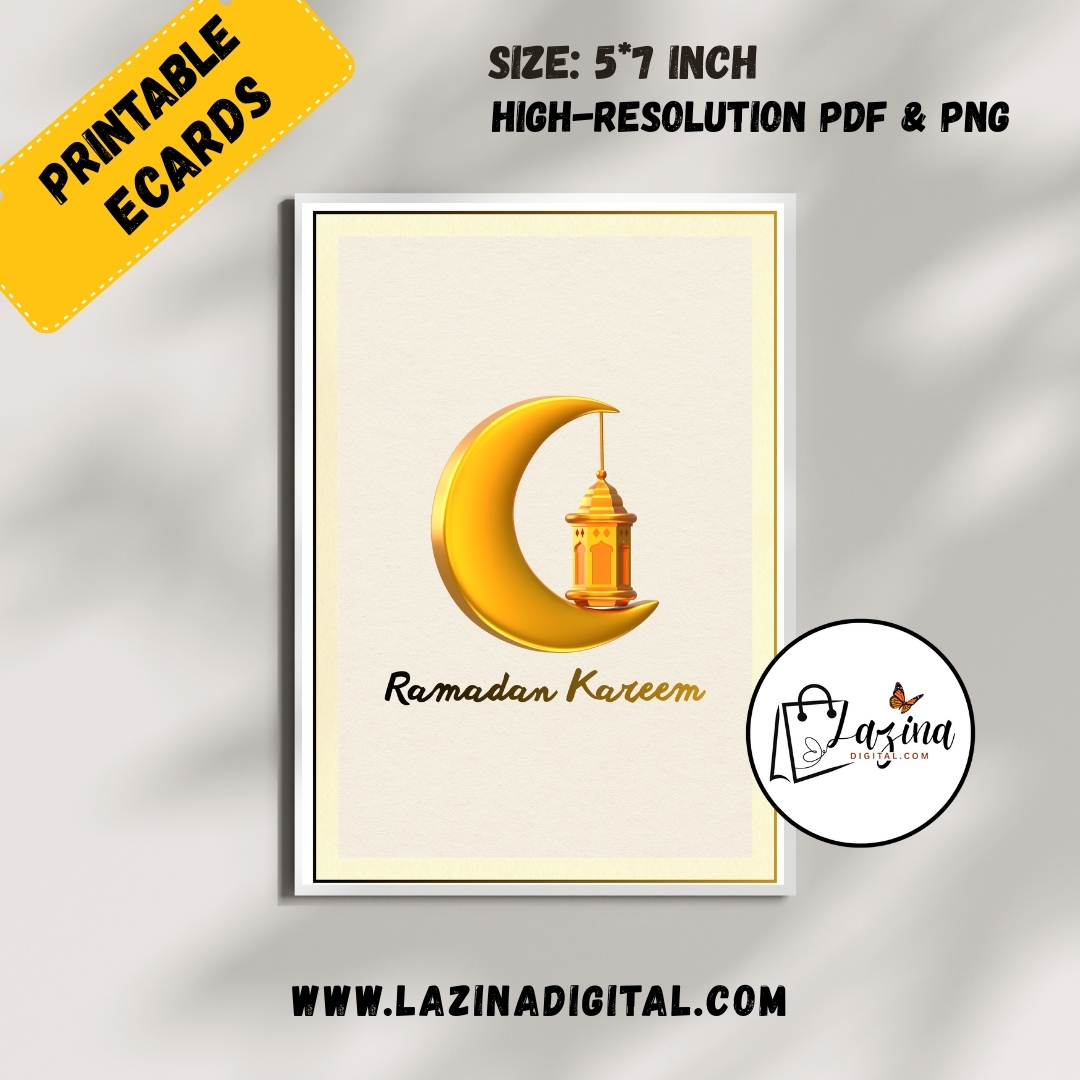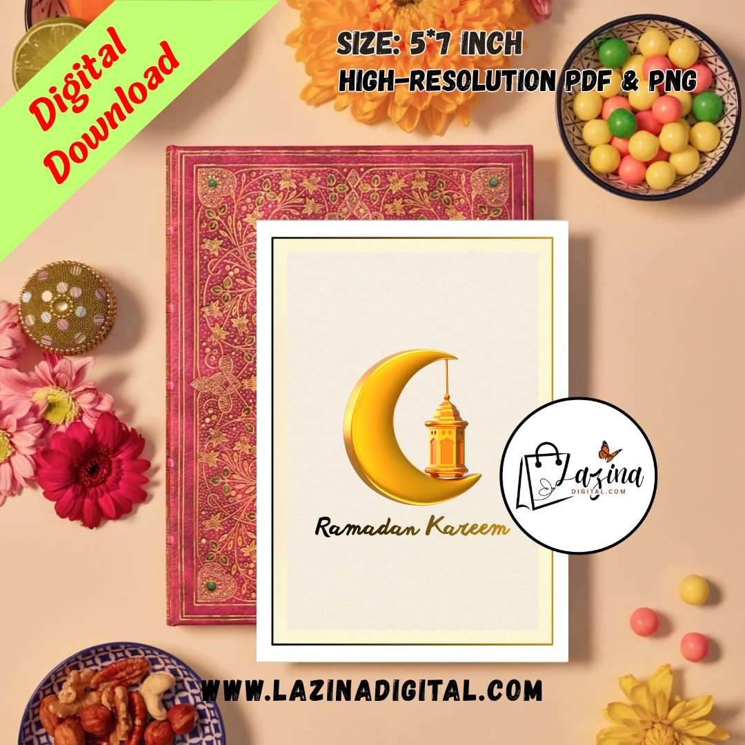 A minimal Ramadan Kareem printable and digital ecard with a moon and lantern in a clean, elegant layout.